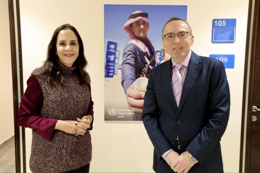 اجتماع بين ممثل منظمة الصحة العالمية في الأردن، الدكتورة إيمان الشنقيطي، ونقيب اختصاصيي المختبرات الطبية الأردنية، الدكتور بشار القسوس