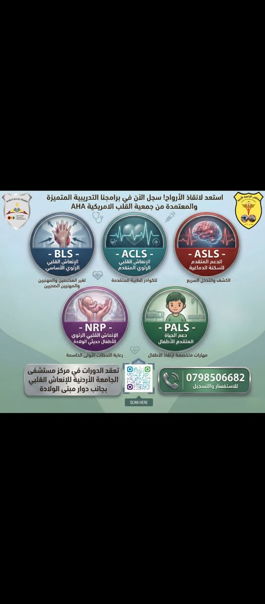 مركز تدريب الإنعاش القلبي في مستشفى الجامعة الأردنية يعلن عن مجموعة من الدورات المتخصصة