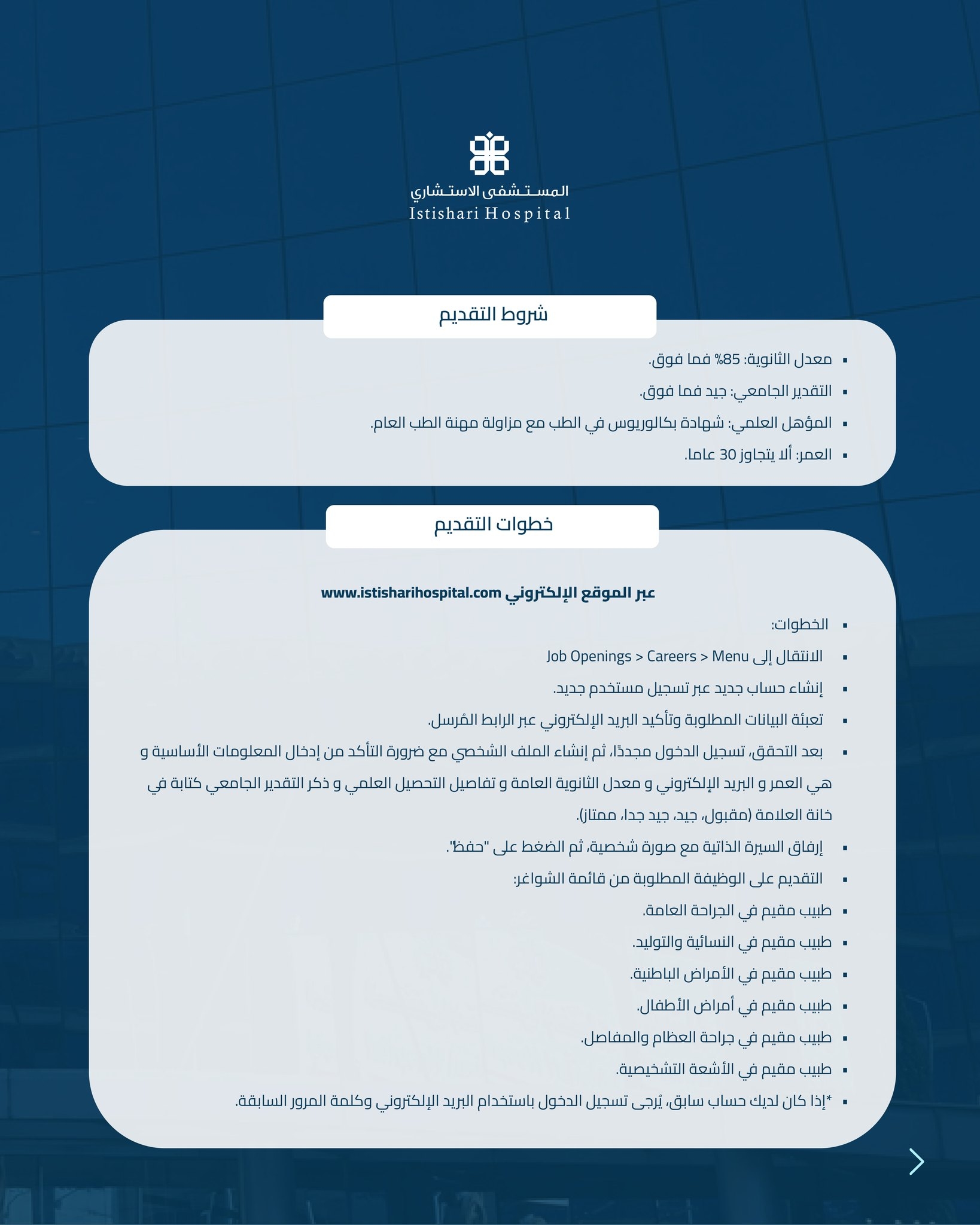 عبر الموقع الإلكتروني www.istisharihospital.com