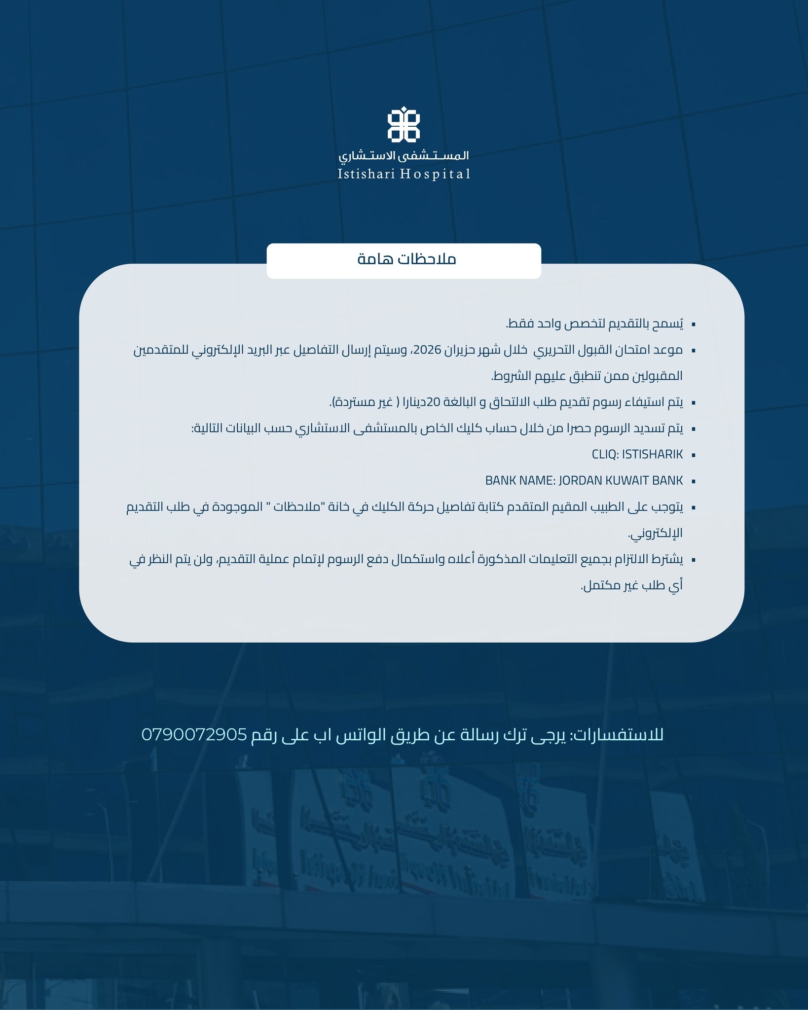 يتم تسديد الرسوم حصرا من خلال حساب كليك الخاص بالمستشفى الاستشاري حسب البيانات التالية: