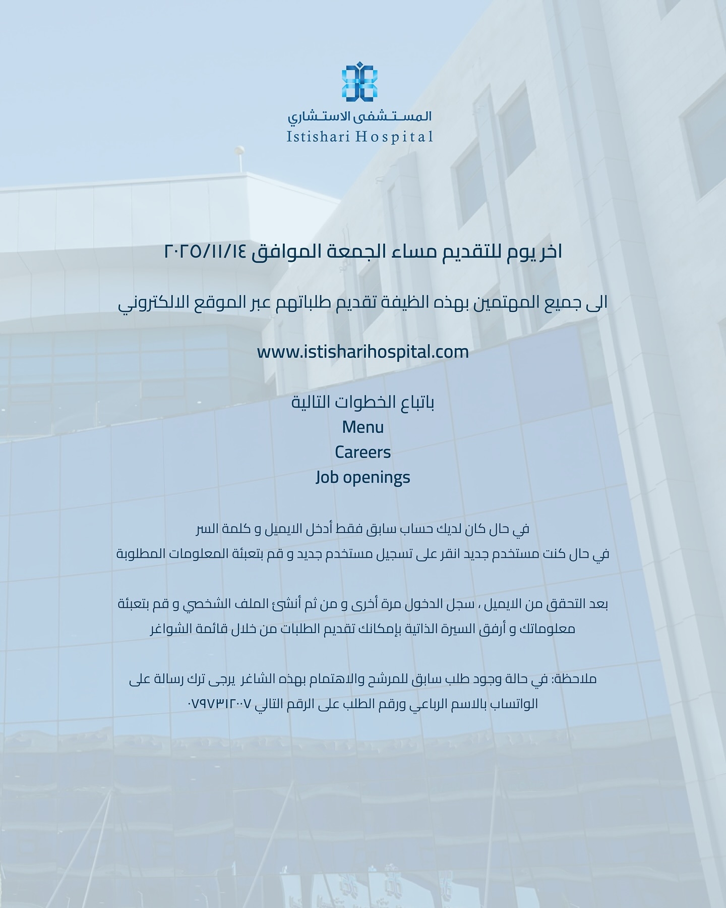 على جميع المهتمين بهذه الوظائف تقديم طلباتهم عبر الموقع الالكتروني www.istisharihospital.com باتباع الخطوات أدناه.