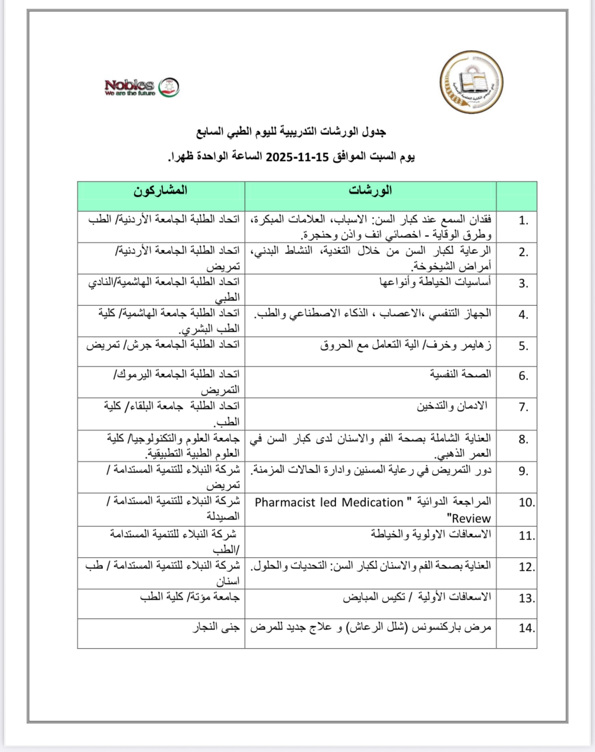 جدول محاضرات والورشات لليوم الطبي السابع في نادي خريجي الكلية العلمية الإسلامية