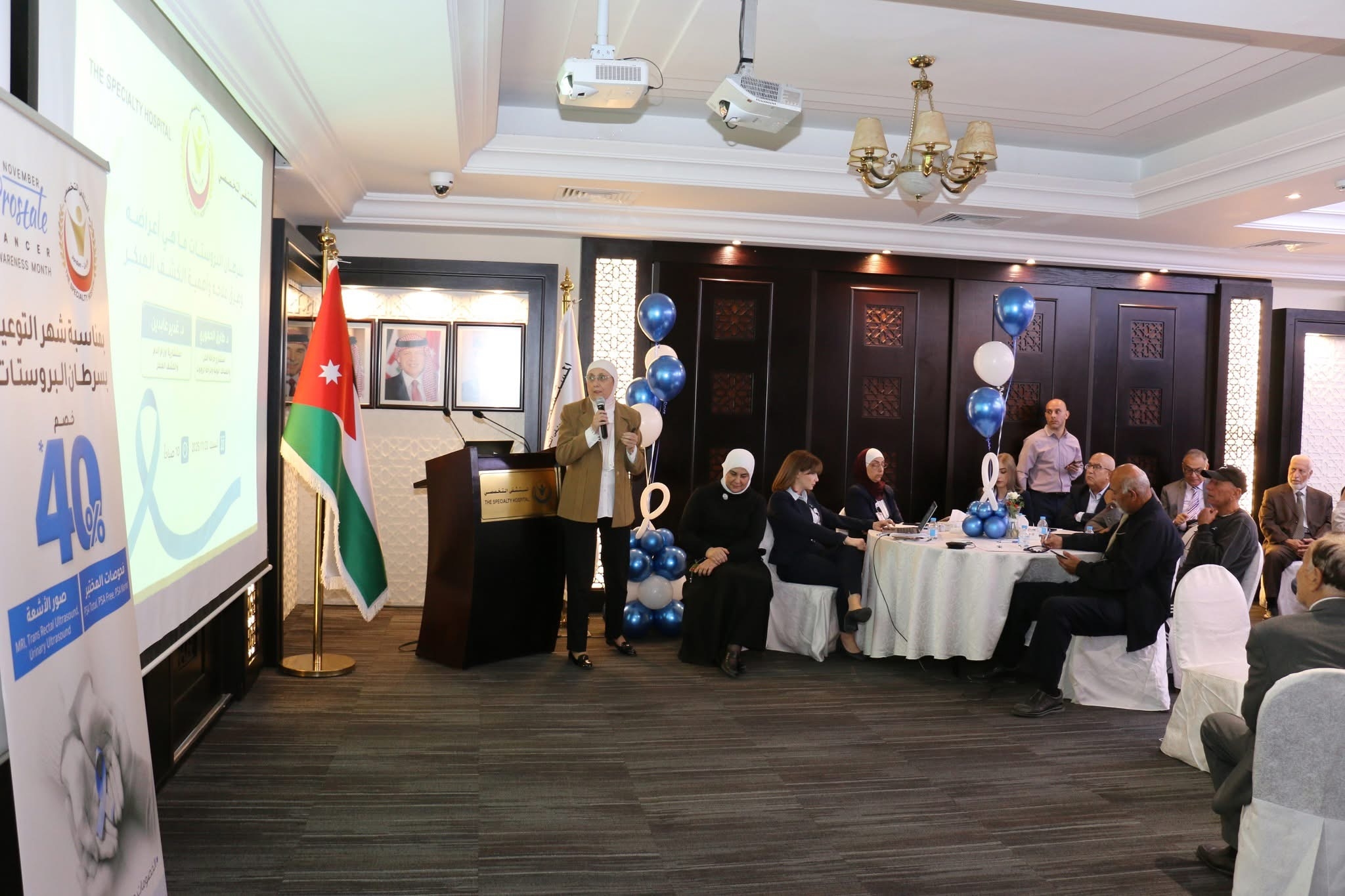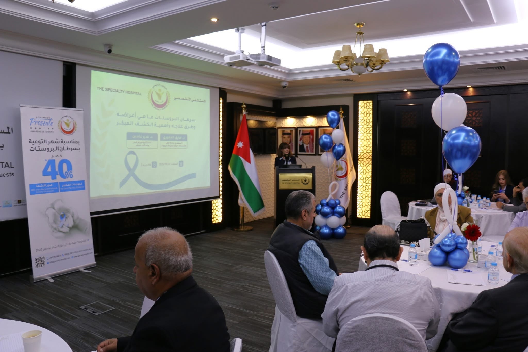 قدّم الدكتور طارق الحموري، استشاري جراحة الكلى والمسالك البولية وجراحة الروبوت، محاضرة تناول فيها أهمية الكشف المبكر لسرطان البروستات ودوره في تحسين فرص الشفاء وتقليل المضاعفات، وأكد على أهمية الفحص الدوري للرجال، خصوصاً لمن لديهم تاريخ عائلي بالسرطان، واستعرض دور غدة البروستات وأهميتها والأمراض المرتبطة بها والعمليات الجراحية التي تُجرى لها. كما أعلن أن المستشفى التخصصي يستعد خلال الفترة المقبلة لإدخال تقنية الروبوت الجراحي لعمليات استئصال البروستات ليصبح أول مستشفى في الأردن يعتمد هذه التقنية المتقدمة، بما يعزز مستوى الخدمات الطبية وفق أحدث المعايير العالمية.