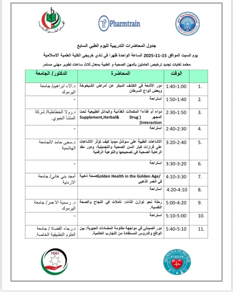 جدول محاضرات والورشات لليوم الطبي السابع في نادي خريجي الكلية العلمية الإسلامية